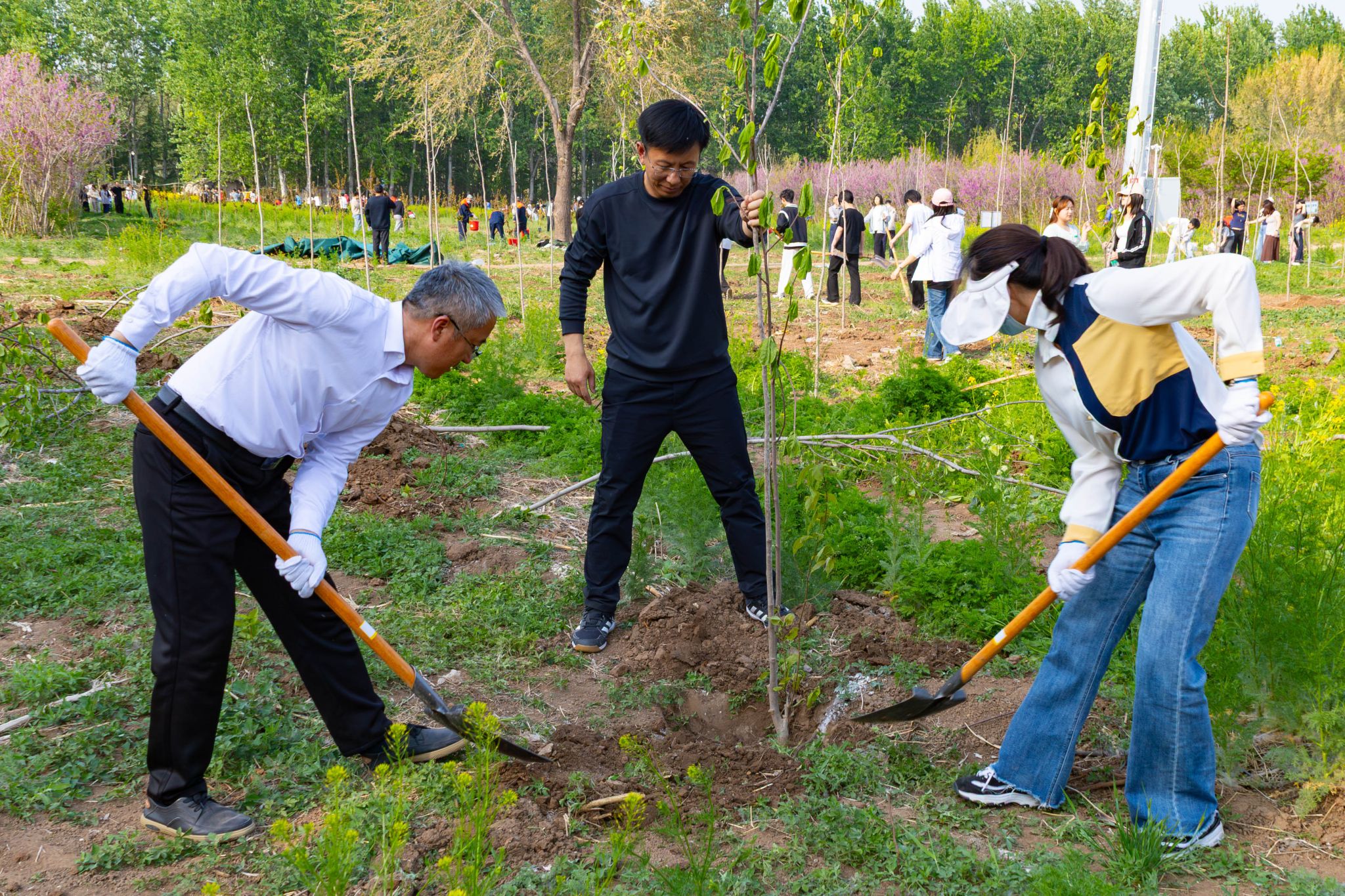活动现场,全体师生分工协作、干劲十足,挥锹铲土、扶苗填坑、踩实浇灌,每一道工序都认真细致、井然有序。经过一下午的辛勤劳作,2000株玉兰和樱花树苗扎根沃土,为校园增添了盎然绿意。师生们在亲身参与劳动的过程中,不仅美化了校园环境,更强化了环保意识,体悟到劳动育人的深刻内涵,让“劳动光荣、实干笃行”的理念深植心中。
